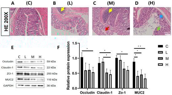 Effects of Phe and Flu exposure on the intestinal barrier: (A) colon tissue control group; (B) low-dose group of colon tissue; (C) medium-dose group of colon tissue; (D) high-dose group of colon tissue at 200×. The yellow arrows indicate lymphofollicular hyperplasia, red arrows indicate colonic mucosal edema, blue arrows indicate colonic mucosal erosion, and green arrows indicate abnormal colonic crypt structure and a decrease in the number of goblet cells; (E) colonic barrier protein Western blot protein band; (F) quantitative analysis of colonic barrier protein bands. Data are presented as mean ± SD (n = 3 independent experiments). Statistical significance was determined by one-way ANOVA followed by Tukey’s test, * p < 0.05, ** p < 0.01.