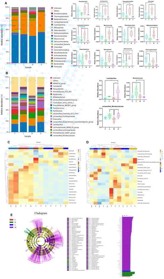 The impacts of Phe and Flu exposure on the gut microbiota composition in rats are visualized through stacked bar charts and heatmaps. At the phylum level (Figure 3A,C), the twenty most abundant phyla are displayed, with Firmicutes and Bacteroidetes being the predominant taxa. Compared to the C group, the M group exhibited significant increases in the relative abundances of Acidobacteriota, Gemmatimonadota, Chloroflexi, unclassified Bacteria, Bdellovibrionota, and Thermoplasmatota (p < 0.05). Conversely, the H group demonstrated marked downregulation of Acidobacteriota, Bdellovibrionota, and Thermoplasmatota (p < 0.05), with notable intergroup differences in phylum-level abundances across dosage groups. Figure 3B,D presents genus-level analyses, revealing a significant upregulation of Lactobacillus in the H group (p < 0.05). As a well-established probiotic, Lactobacillus may play a pivotal role in these observed microbial alterations.