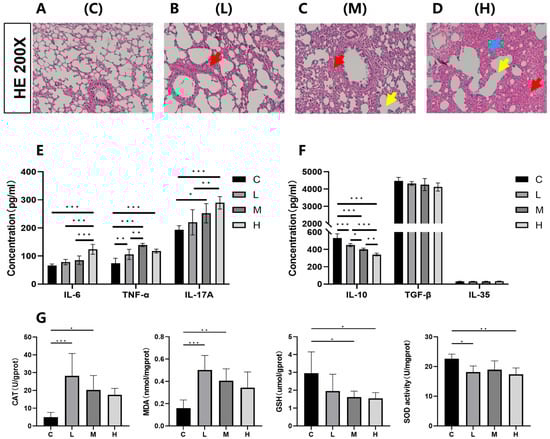 Effects of Phe and Flu on lung inflammatory damage and oxidative stress: (A) control group of lung tissue; (B) low-dose group of lung tissue; (C) medium-dose group of lung tissue; (D) high-dose group of lung tissue at 200×. The red arrows indicate alveolar septal congestion, yellow arrows indicate alveolar collapse, and blue arrows indicate inflammatory cell infiltration; (E) pulmonary pro-inflammatory factors IL-6, TNF-α, and IL-17A concentration levels; (F) pulmonary anti-inflammatory factors IL-10, IL-35, and TGF-β concentration levels; (G) pulmonary oxidative stress CAT, MDA, reduced GSH, and SOD concentration levels. Data are presented as mean ± SD (n = 6 independent experiments). Statistical significance was determined by one-way ANOVA followed by Tukey’s test, * p < 0.05, ** p < 0.01, *** p < 0.001.