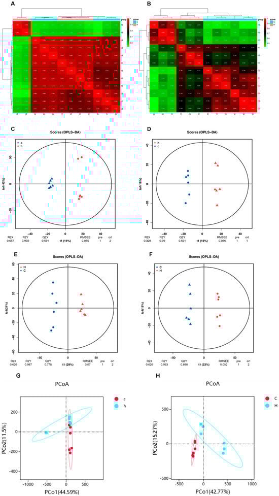 In evaluating the effects of Phe and Flu on colon and lung tissues, we selected the C and H group samples for untargeted metabolomics. Using LC-QTOF (positive/negative modes), we detected a total of 23,016 ion peaks (4417 annotated metabolites) and identified significant metabolic alterations via multivariate analysis. The quality of intra-group data was assessed by evaluating repeatability through correlation analysis, utilizing the Spearman rank correlation coefficient (r) as the metric for biological repeatability (Figure 5A,B). Intergroup sample differences were evaluated through principal coordinate analysis (PCoA). The PCoA score plot for lung tissue (Figure 5G) demonstrated partial overlap alongside distinct separation between the C group (denoted by red solid ellipse) and the H group (denoted by blue solid ellipse). Notably, in the PCoA score plot for intestinal contents (Figure 5H), complete separation was observed between the C and H groups. To better identify differential metabolites, orthogonal partial least squares discriminant analysis (OPLS-DA) was used to reveal group-specific metabolic trends. This supervised multivariate model reduces noise and enhances discriminative variable extraction, outperforming unsupervised PCoA in classification. In Figure 5C–F, pairwise comparisons between the C and H groups revealed distinct inter-group variations in the OPLS-DA score plots across all experimental groups. Notably, the R2Y values approached unity (≈1), while the Q2Y values consistently exceeded 0.5, demonstrating robust model repeatability and predictive capability. These findings collectively affirm the high reliability of the experimental dataset.