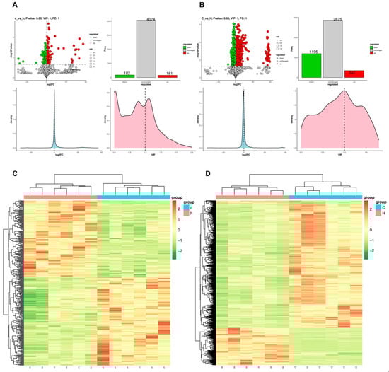 Analysis was conducted in both ionization polarities, employing the screening criteria of VIP > 1, |fold change (FC)| > 1, and p < 0.05. A total of 343 differentially expressed metabolites were identified in lung tissue, comprising 161 upregulated and 182 downregulated metabolites (Figure 6A). In colon contents, 1542 differentially expressed metabolites were detected, including 347 upregulated and 1195 downregulated metabolites (Figure 6B). Hierarchical cluster analysis was performed, and the resulting differentially expressed metabolites were visualized as heatmaps (Figure 6C,D), which clearly demonstrated the metabolic disparities between the lung and intestinal tissues of the C and H groups.
