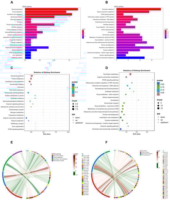 To elucidate the biological functions of differentially expressed metabolites, this study employed the KEGG database for classification, annotation, and pathway enrichment analysis, thereby identifying key metabolic and signaling pathways associated with these metabolites. As illustrated in Figure 7A–D, the differentially expressed metabolites in lung tissue were predominantly linked with amino acid and lipid metabolism, exhibiting significant enrichment in pathways including steroid biosynthesis, purine metabolism, and arachidonic acid metabolism. In the colon, these metabolites were primarily involved in amino acid metabolism, lipid metabolism, as well as cofactor and vitamin metabolism, with notable enrichment observed in pathways such as pyrimidine metabolism, arginine and proline metabolism, and the PPAR signaling pathway. To further clarify the associations between differentially abundant metabolites and pathways, this study built an enrichment chord diagram (Figure 7E,F), showing that Phe and Flu induce metabolic dysregulation in rat pulmonary and intestinal tissues. These interconnected metabolites form a regulatory network affecting overall metabolic homeostasis.