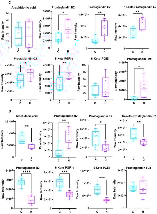 Subsequently, a total of 143 differentially expressed metabolites were identified as commonly altered in both lung and colon tissues (Figure 8A). Pathway enrichment analysis revealed that these shared differential metabolites were predominantly involved in AA metabolism, serum neurosynaptic processes, purine metabolism, and the oxytocin signaling pathway. The present investigation primarily focused on AA metabolism, identifying key metabolites comprising AA, prostaglandin H2 (PGH2), prostaglandin E2 (PGE2), prostaglandin C2 (PGC2), and prostaglandin F2α (PGF2α). As illustrated in Figure 8D, relative abundance significant reductions (p < 0.05) were observed in the intestinal metabolites AA, PGE2, 15-keto-PGE2, PGB2, 6-Keto-PGF1α, and 6-Keto-PGE1 in the H group relative to the C group. Conversely, as shown in Figure 8C, the lung tissue metabolites PGH2, PGE2, 15-keto-PGE2, PGC2, 6-Keto-PGF1α, and PGF2α exhibited relative abundance significant elevations (p < 0.05) in the H group compared with the C group. As is well established, AA metabolism exerts diverse physiological functions in the human body, with its metabolites serving as pro-inflammatory lipid mediators. In conjunction with the metabolomic analyses of lung and colon contents, the present findings indicate that dysregulation in AA may contribute to the pathogenic mechanism underlying pulmonary inflammation.