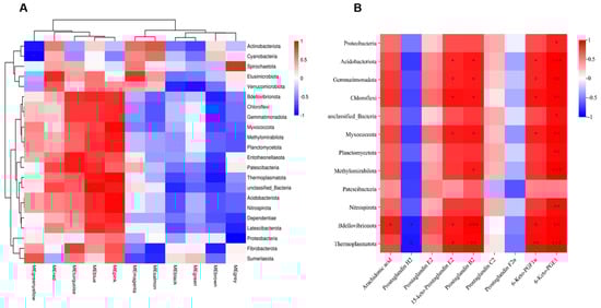 Combined analysis of gut microbiota and metabolites after Phe and Flu exposure: (A) metabolite module microbial correlation heatmap; (B) heatmap of correlation between AA metabolites and differential phyla, n = 6 independent experiments. * p < 0.05, ** p < 0.01, *** p < 0.001.