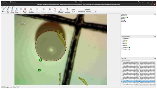 While the dataset provides labels for the type of microplastic in each image, it includes pixel-level segmentation masks. A significant part of this work involves annotating these images to generate precise pixel-level masks, which are essential for training and evaluating semantic segmentation models. Figure 2 shows a list of samples from this dataset as well as their segmentation masks. The annotation tool we use is LabelMe v5.9.0 (https://github.com/labelmeai/labelme, accessed on 23 November 2025), a Python-based tool designed for pixel-level annotation. We utilized its polygon annotation feature to trace the microplastic boundaries, and these polygons were subsequently converted into pixel-level bitmap segmentation masks for model training. A snapshot of the annotation process is shown in Figure 3. After annotation, detailed statistics of the microplastics in this dataset were determined, which are provided in Figure 4.