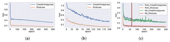 We trained each model for 300 epochs, with batch size of 8, using the RMSprop optimization algorithm []. This batch size was deliberately chosen to ensure a fair comparison across all benchmarked models. Specifically, with an input image resolution of pixels, one of the larger comparison models (Nested UNet) reached its maximum stable batch size of 8 on the 24 GB VRAM GPU. Therefore, to maintain identical training conditions and prevent the batch size from influencing comparative results, we standardized the batch size at 8 for all architectures, including our own model.