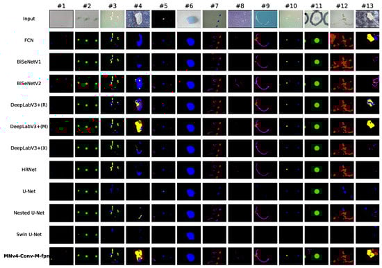 Previous studies have explored the use of deep neural network models for microplastic image segmentation. These works are summarized in Table 1. The majority of these studies focus on binary segmentation, where images are categorized simply as microplastics versus background. For instance, ref. [] employed a U-Net [] to separate microplastics from background elements. Similarly, ref. [] used MultiResU-Net [], demonstrating improved accuracy. Other works have utilized architectures such as ResNet [] combined with a feature pyramid network [], various U-Net derivatives [], and HRNet [,]. While some works have advanced toward multi-class segmentation, such as [], which segmented beach and marine debris into five morphological categories, most remain focused on binary classification.
