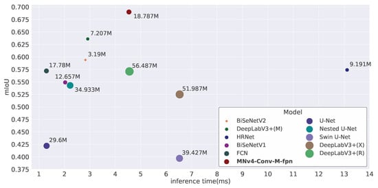 This is further illustrated in Figure 8, where our model surpasses the second-best model by as much as in mIoU while maintaining a 4.5 ms inference time, making it fast enough for real-time applications.