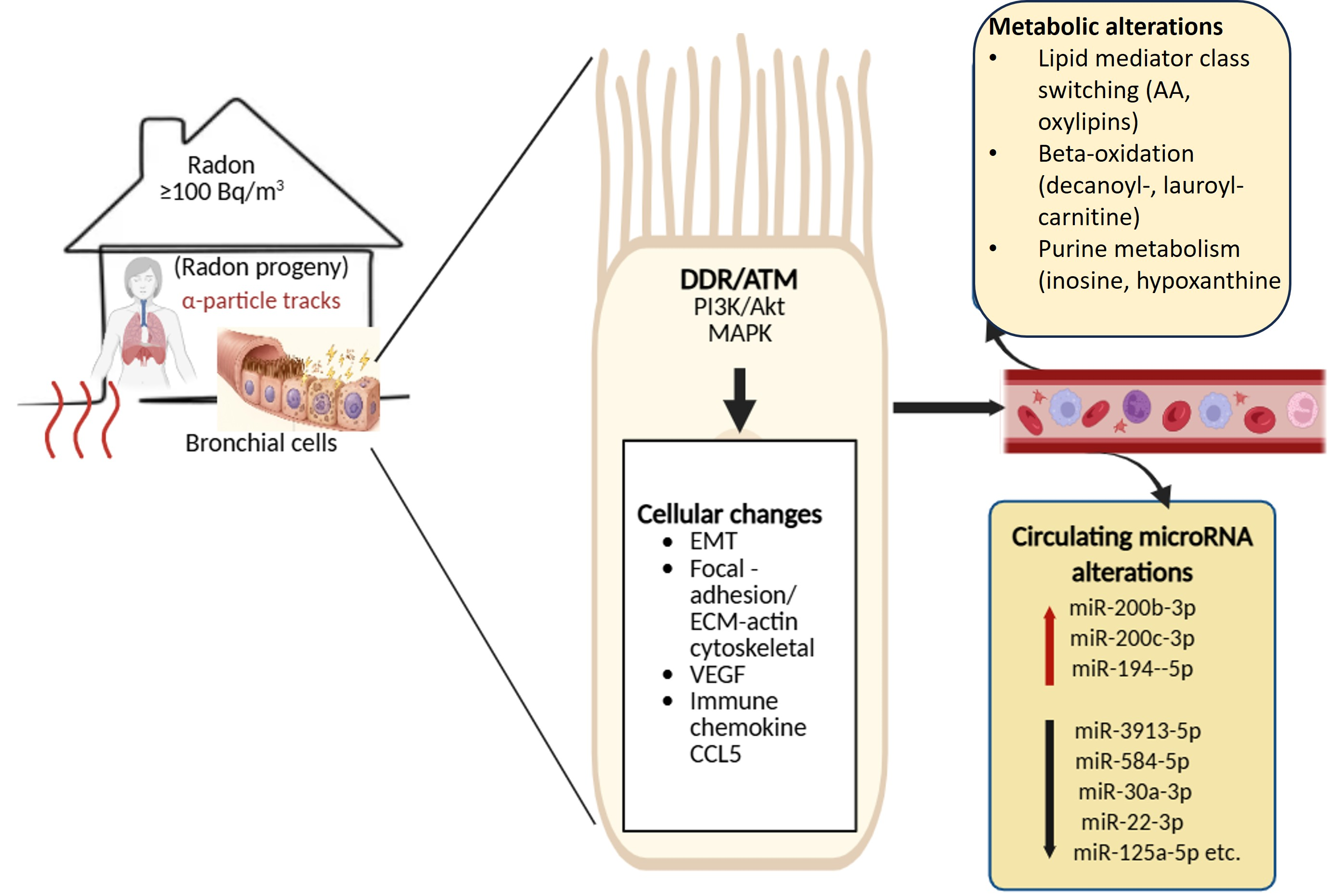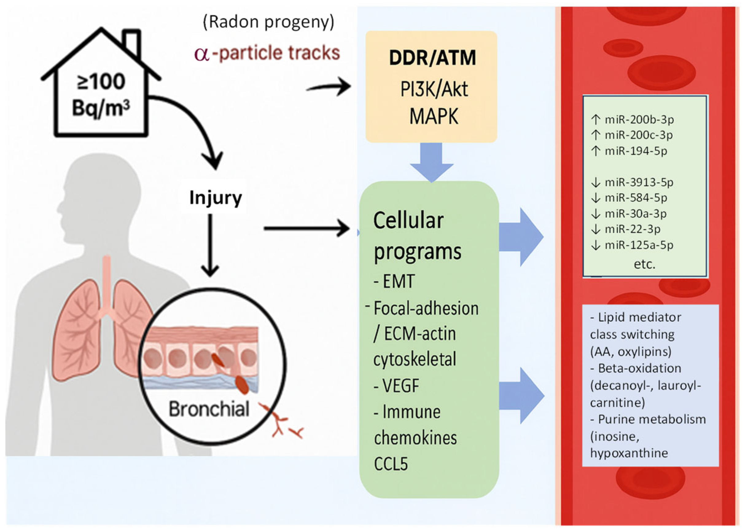 Residential radon is a leading environmental cause of lung cancer, but circulating biomarkers linking home exposure to pathogenic biology are not well defined. We conducted an exposure-contrast study in Hang Dong District, Chiang Mai, measuring indoor radon in 48 homes and enrolling adults from <50 Bq/m3 (low) and ≥100 Bq/m3 (high) households for serum profiling. Mean indoor radon was 61.8 ± 18.4 Bq/m3 (range 34–126), with 6.2% of homes ≥100 Bq/m3. Small RNA sequencing identified 55 differentially expressed miRNAs (12 up, 43 down) in high-radon serum. Notably, miR-200b-3p, miR-200c-3p, and miR-194-5p were increased, while miR-3913-5p, miR-584-5p, miR-30a-3p, miR-22-3p, and miR-125a-5p were decreased. Target enrichment (KEGG/GO) implicated PI3K–Akt and MAPK hubs with Ras/Wnt/VEGF alongside focal adhesion/ECM–receptor/actin–cytoskeleton and immune-regulatory modules. Untargeted LC–MS metabolomics showed exposure-aligned shifts: higher PUFAs and oxylipins (e.g., AA, EPA; 9-HEPE, 8-HETE, 5,12-DiHETE), elevated acyl-carnitines (β-oxidation), and increased inosine/hypoxanthine, consistent with lipid/steroid remodeling, mitochondrial fuel reprogramming, oxidative stress, and nucleotide turnover. Integrated interpretation supports DDR/ATM → PI3K/Akt–MAPK activation with EMT/adhesion remodeling, angiogenic signaling, and immune modulation—linking residential radon to lung cancer mechanisms. Given the small sample size (n = 10), these findings should be interpreted as preliminary and hypothesis-generating, warranting validation in larger cohorts. Nevertheless, findings support household testing, remediation at ≥100 Bq/m3, and integrated exposure studies considering PM2.5 co-exposures.