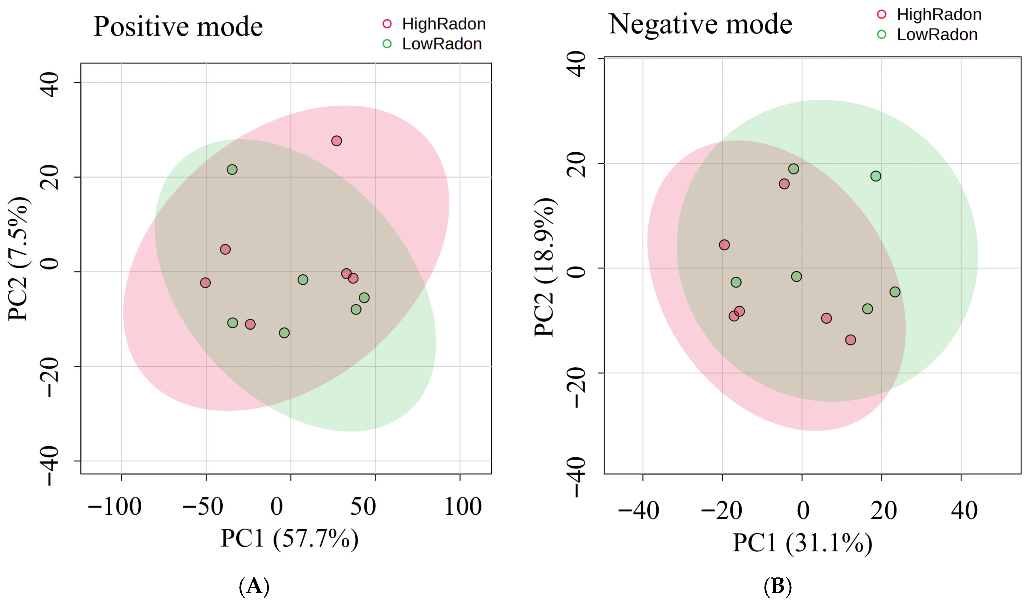 Serum metabolomic profiles from individuals residing in high- and low-radon exposure areas were characterized using LC–MS in both positive and negative ion modes. After rigorous QC filtering and normalization, the datasets were subjected to multivariate and univariate statistical analyses to explore group-wise differences. To assess overall differences in serum metabolomic patterns between high- and low-radon exposure groups, we first performed PCA (Figure 5). In the positive ion mode (Figure 5A), PC1 and PC2 explained 65.2% of the total variance (PC1 = 57.7%, PC2 = 7.5%), while in the negative ion mode (Figure 5B), they accounted for 52.0% (PC1 = 33.1%, PC2 = 18.9%). In both modes, samples from the two groups exhibited partial overlap but also showed a trend toward separation along PC1. This indicates that while radon exposure does not completely segregate individuals into distinct metabolic clusters, it induces measurable shifts in the global metabolomic landscape. Such patterns suggest that radon exposure may subtly but consistently alter systemic metabolic processes.