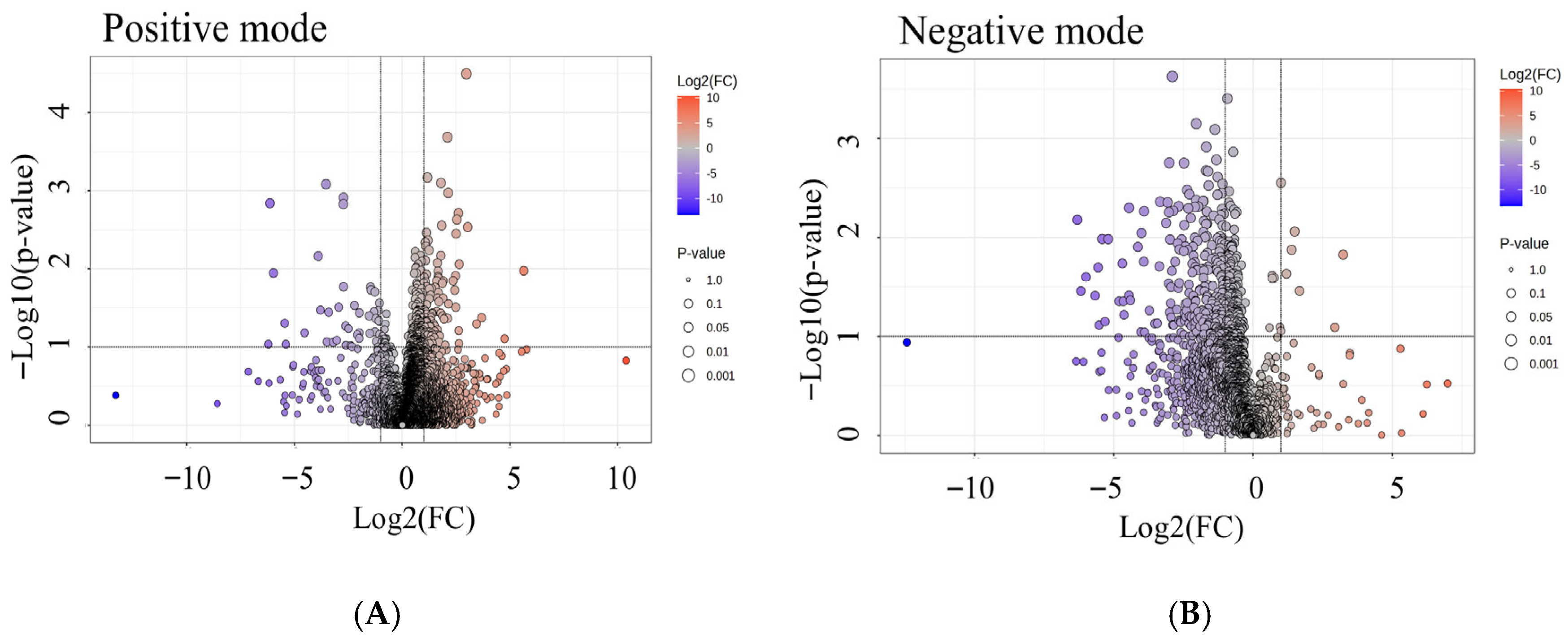 To identify the specific metabolites driving these global differences, volcano plots were constructed for both ion modes (Figure 6). Each dot represents a metabolite feature, with the x-axis reflecting fold change (log2FC) and the y-axis showing statistical significance (−log10 p-value). Features to the right are more abundant in the high-radon group, while those to the left are enriched in the low-radon group. In both positive and negative modes (Figure 6A,B), numerous metabolites passed the thresholds for both significance and fold change, highlighting clear exposure-related differences. The distribution of significant features indicates that radon exposure perturbs multiple metabolic pathways, with several metabolites showing consistent enrichment in high-radon individuals. Together, these analyses reveal that radon exposure alters both the global structure of serum metabolic profiles and the abundance of specific metabolites, pointing to lipid metabolism, steroid biosynthesis, and nucleotide turnover as the pathways most affected.