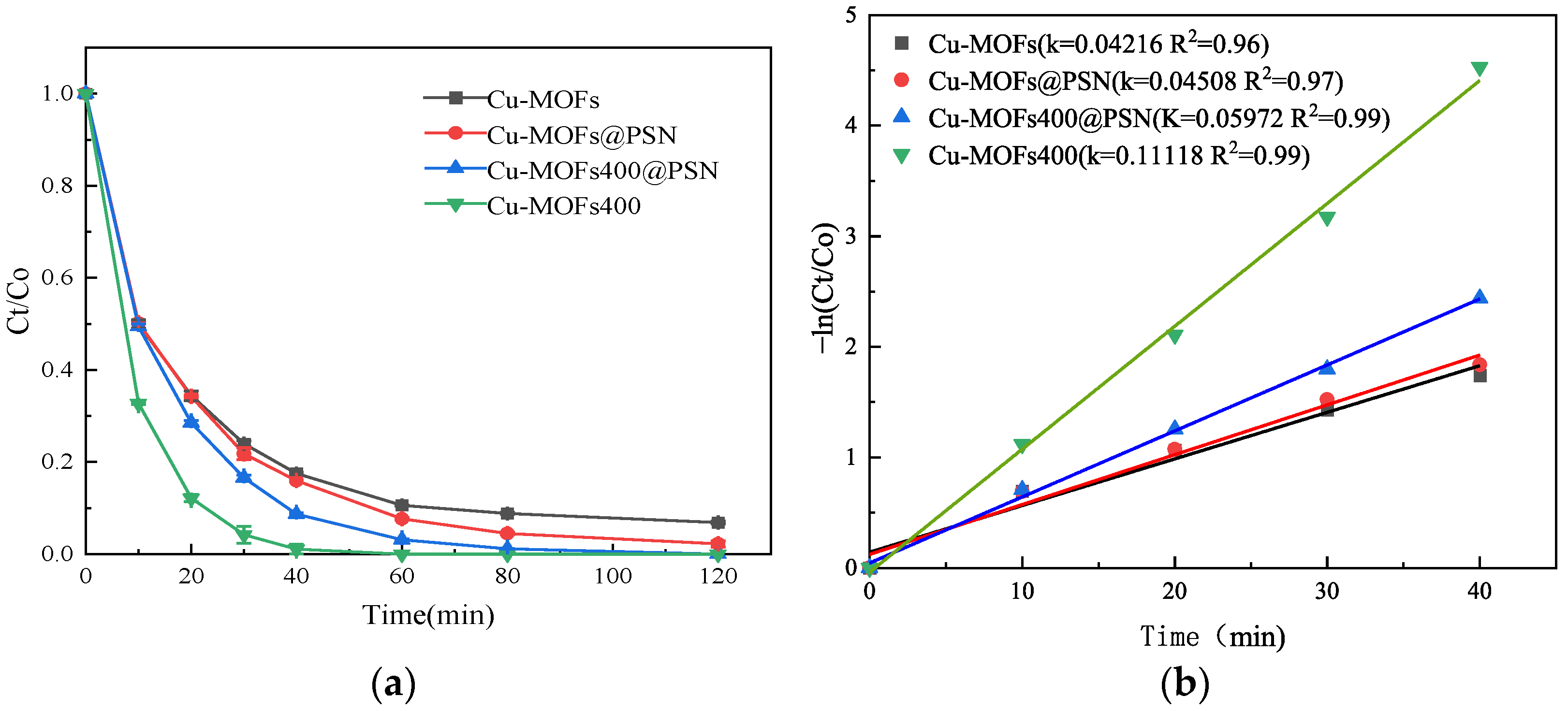 - Liu, S.; Lai, C.; Qin, L.; Ma, D.; Zhou, X.; Yan, H.; Xu, F.; Tang, L.; Yuan, X. Peroxydisulfate activation by copper metal-organic framework derivatives: Deciphering the role of copper species. Environ. Res. 2025, 283, 122142. [Google Scholar] [CrossRef] [PubMed]