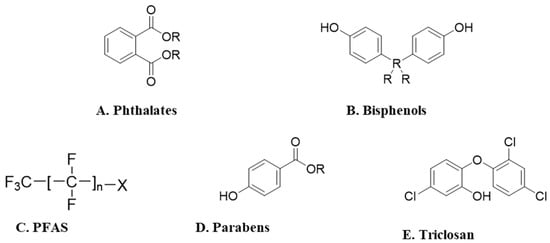 Bisphenol-A (BPA) and other bisphenol substitutes (such as BPF, BPP, BPS, and BPAF), parabens (PBs), phthalates (PEs), triclosan (TCS), and per- and polyfluoroalkyl substances (PFAS) are well-recognized endocrine-disrupting chemicals (EDCs) (Figure 1).
