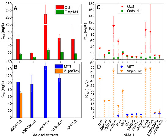 Bioassays performed with: (A,B) simulated biomass burning (sBB) and ambient anthropogenic (AA) aerosol extracts, and (C,D) individual NMAHs and their mixtures (Σ10NMAHs and Σ5NMAHs). (A,C) Inhibition of zebrafish (Danio rerio) organic cation transporter 1 (Oct1) and organic anion-transporting polypeptide 1d1 (Oatp1d1), expressed as half-maximal inhibitory concentrations (IC50) for uptake of the fluorescent model substrates ASP+ and Lucifer yellow, respectively. (B,D) Acute cytotoxicity in PLHC-1 fish cells assessed by MTT assay, and chronic toxicity in the freshwater green alga Scenedesmus subspicatus using the AlgaeTox assay, expressed as IC50. Vertical bars represent 95% confidence interval for IC50.