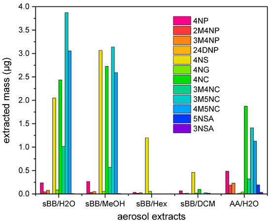 The total quantified mass of ten NMAHs in sBB extracts decreased in the order: water (12.9 µg) ≈ methanol (12.5 µg) > hexane (1.3 µg) > dichloromethane (0.7 µg), highlighting NMAHs strong solubility in polar solvents. Neither nitrocatechols (NCs; 4NC, 3M4NC, 3M5NC, 4M5NC) nor nitrosalicylic acid (NSAs) were quantified in the hexane extract. Five compounds (3M5NC, 4M5NC, 4NC, 4NS, and 3M4NC) accounted for 96.5% of total NMAH mass in the sBBH2O. Based on these results, AA aerosols were extracted using water only. In AAH2O, NCs were also the most abundant compounds (79.8%), followed by NPs (16.3%) and NSAs (3.9%) (Figure 2). The concentration of 2,4DNP was below the quantification limit in all extracts, while 3NSA was detected only in AAH2O. This is consistent with previous findings indicating that 2,4DNP and 3NSA typically occur at low concentrations in European ambient aerosols [9,48].