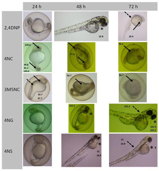 Representative morphological abnormalities observed in Zebrafish (Danio rerio) embryos following exposure to selected sublethal concentrations of 2,4DNP, 4NC, 3M5NC, 4NG, 4NS (indicated in mg/L). Noted deformations include cardiac edema (asterisk), spinal curvature (dashed arrow), and necrosis of head and tail (solid arrow).