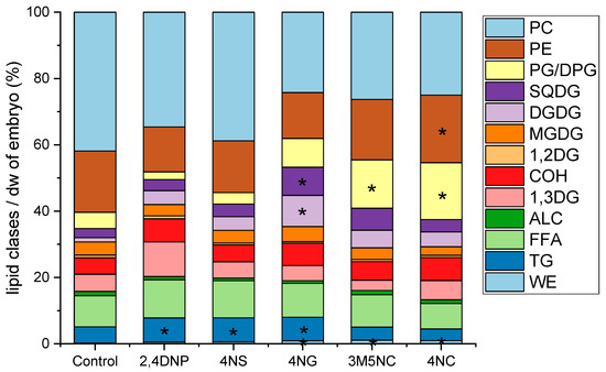 The total analysed lipid content of zebrafish embryos exposed to NMAHs for 48 hpf ranged from 23.2% (4NG) to 28.9% (4NC) of dry weight, representing a statistically significant increase compared to unexposed control (18.7%, t-test, p < 0.05). Triacylglycerol levels were significantly elevated in embryos exposed to 2,4DNP, 4NS, and 4NG, but not in those treated with 3M5NC or 4NC. Increases were also observed for PE in embryos exposed to 4NC; WE in those treated with 3M5NC, 4NC, and 4NG; and PG/DPG in those exposed to 3M5NC and 4NC. Additionally, DGDG and SQDG levels were significantly elevated in embryos exposed to 4NG (Figure 4).