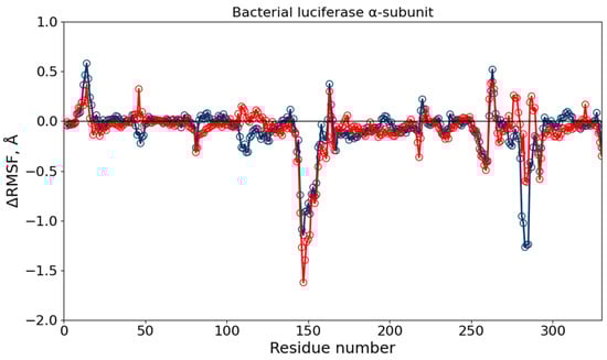 ΔRMSF of Cα atoms of the BLuc α-subunit in different solutions, calculated relative to the system in water. Blue empty markers show the difference between RMSF in 10% DMSO aqueous solution and water, red empty markers—between 10% DMSO aqueous solution with diesel and water. The negative ΔRMSF corresponds to a more rigid segment as compared with the structure in water.