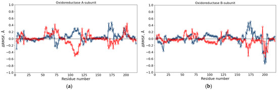 ΔRMSF of Cα atoms of the Red subunit A (a) and subunit B (b) in different solutions, calculated relative to the system in water. Blue empty markers show the difference between RMSF in 10% DMSO aqueous solution and water, red empty markers—between RMSF in 10% DMSO aqueous solution with diesel and water. The negative ΔRMSF corresponds to a more rigid segment as compared with the structure in water.
