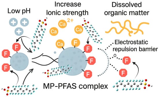 While pH, ionic strength, and dissolved organic matter (DOM) are established as master variables controlling the MP-PFAS interaction, several other critical environmental parameters can significantly alter adsorption dynamics and the stability of the complex. A more holistic view must incorporate the roles of temperature, the presence of co-contaminants, and the intrinsic properties of the aqueous matrix itself. Temperature is a fundamental driver of adsorption thermodynamics and kinetics. An increase in temperature typically enhances the diffusion rate of PFAS molecules, potentially accelerating the attainment of sorption equilibrium. However, its effect on sorption capacity is complex and system-dependent. Adsorption is an exothermic process for many hydrophobic interactions; therefore, higher temperatures can decrease the sorption capacity of long-chain PFAAs onto MPs, as described by the van’t Hoff equation. In contrast, for interactions driven by endothermic processes, such as the pore diffusion of larger molecules or specific chemical interactions, sorption may increase with temperature. Salawu et al. [14] provided evidence for the spontaneity of PFAS adsorption onto secondary MPs, but the specific influence of temperature on this process remains an area requiring systematic investigation, particularly under field-relevant fluctuating thermal regimes.