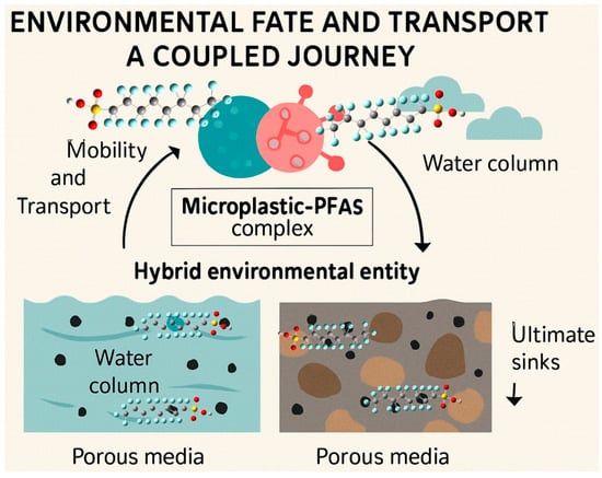 The formation of the microplastic–PFAS complex creates a new, hybrid environmental entity whose behavior is distinct from that of either contaminant in isolation (Figure 4). This coupling fundamentally alters the mobility and transport pathways of both pollutants in porous media (like sediments and soils) and water columns, with consequences for their distribution, long-range transport, and ultimate sinks.