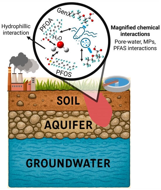 In porous media, the MP-PFAS complex can exhibit transport behavior that is a composite of its components. PFAS, particularly the shorter-chain, more hydrophilic varieties, are typically highly mobile in groundwater and saturated soils due to their solubility and anionic repulsion from negatively charged soil particles. However, when sorbed onto microplastics, their mobility becomes tied to the fate of the particle. If the MP carrier is itself mobile, a small, buoyant, and low-density polyethylene particle, it can facilitate the transport of PFAS, acting as a vehicle that enables the contaminants to penetrate deeper into aquifers or travel further than they would alone. This is a significant concern for groundwater contamination plumes emanating from landfills or contaminated sites where both pollutants co-occur. Conversely, if the MP is large, dense, or readily filtered by the soil matrix, the complex can experience enhanced retention. The PFAS, which would otherwise be mobile, is effectively pulled out of the water phase by the deposition of its MP carrier, leading to an accumulation of PFAS in the sediment or soil layers. Zhao et al. [29] demonstrated this principle, showing that the transport of polytetrafluoroethylene (PTFE) MPs in porous media was influenced by PFAS co-transport, with the recovery rate of PTFE decreasing under conditions that favor deposition (lower pH, higher ionic strength), thereby also sequestering the associated PFAS.