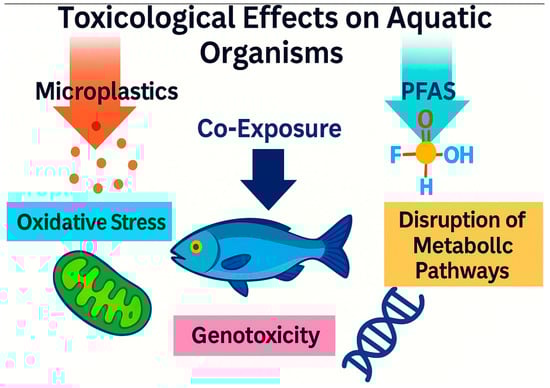 The interaction becomes particularly complex in mammalian models, which provide insights into potential human health risks. Jiang et al. [32] demonstrated that the co-exposure of PS-MPs and PFBS in mice led to a synergistic disruption of the gut-liver axis. This was characterized by gut microbiota dysbiosis, damage to the intestinal barrier, and subsequent dysregulation of hepatic lipid metabolism, culminating in pronounced liver steatosis (fatty liver disease). The MPs were found to enhance the bioavailability and tissue retention of PFBS, creating a more severe pathological outcome than either contaminant could produce independently. This suggests the nexus can amplify metabolic syndrome-like conditions. Furthermore, research indicates toxicity beyond metabolic organs. Studies report that co-exposure can induce higher levels of genotoxicity in lymphocytes and more significant oxidative damage in the brain and renal tissues of vertebrate models. The combination also appears to aggravate the immunotoxicity of PFAS, leading to a greater suppression of immune function. These findings across multiple vertebrate systems underscore that the MP-PFAS nexus is not merely an ecological issue but a potential driver of systemic health failures in higher organisms, highlighting an urgent need for more targeted toxicological assessment in vertebrates.