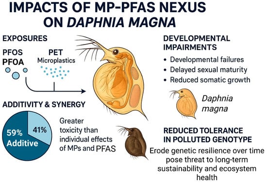 The impacts of the MP-PFAS nexus are starkly revealed in chronic toxicity studies using invertebrate sentinel species, which demonstrate that co-exposure can lead to severe developmental impairments and population-level consequences. The water flea Daphnia magna, a cornerstone of freshwater ecosystems and ecotoxicological testing, is particularly vulnerable. The research by Soltanighias et al. [15] provides a comprehensive and alarming insight into these effects. Their study investigated the chronic toxicity of PFOS, PFOA, and polyethylene terephthalate microplastics (PET) on two genotypes of Daphnia magna. Unlike conventional short-term studies, their life-cycle analysis revealed profound impacts on the organisms’ entire development and reproductive fitness (Figure 7). They found that co-exposure to PFAS and MPs caused developmental failures, delayed sexual maturity, and reduced somatic growth. Crucially, the study demonstrated that the combined effect of these persistent chemicals was 59% additive and 41% synergistic, with no antagonistic interactions observed. This means that in a significant number of cases, the toxicity of the mixture was greater than the sum of the individual effects of MPs and PFAS, leading to unexpectedly severe outcomes. Furthermore, the study highlighted a critical ecological insight: a genotype with a historical exposure to environmental pollution showed reduced tolerance to the MP-PFAS mixture, suggesting that the cumulative fitness costs from past pollution have eroded the population’s capacity to cope with new, combined stressors. This indicates that the nexus does not only cause direct mortality but can also erode genetic resilience over time, posing a long-term threat to population stability and ecosystem health.