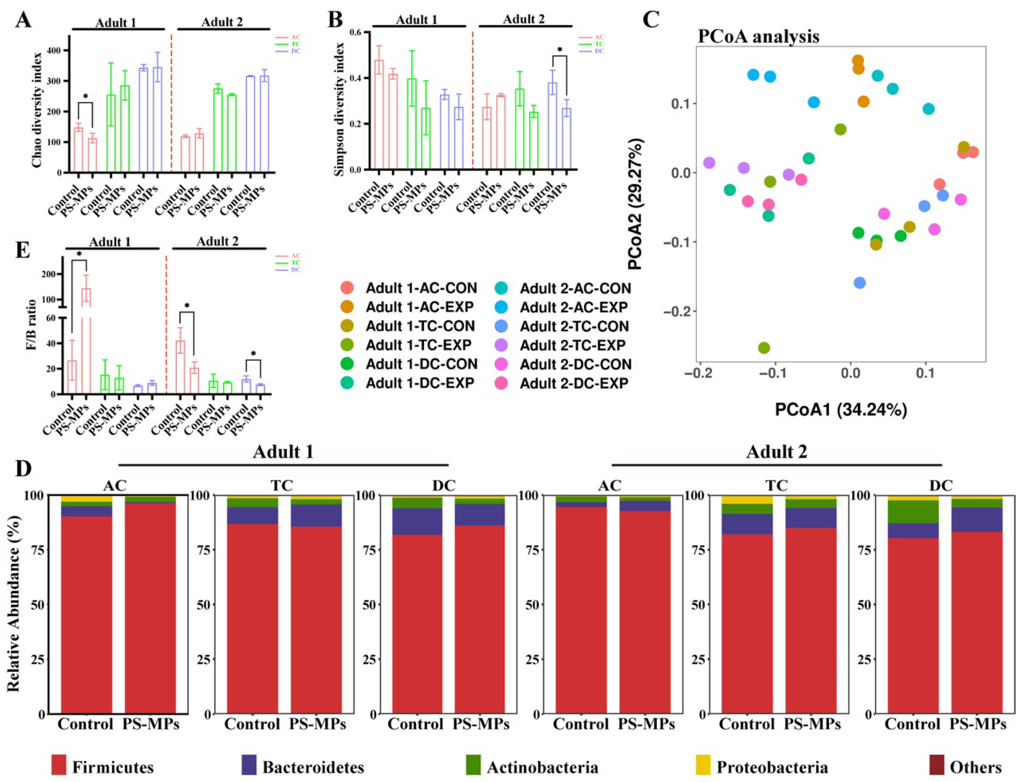 3.1. Effect of PS-MP Exposure on the Gut Microbiota Composition