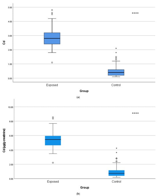 Urinary Cd concentrations were approximately five-fold greater in the exposed workers (2.90 ± 0.72 µg/L or 5.48 ± 1.22 µg/g creatinine) than the control subjects (0.50 ± 0.40 µg/L or 0.97 ± 0.79 µg/g creatinine; p < 0.001), as illustrated in Figure 1a,b, thus providing evidence of chronic occupational exposure to Cd.