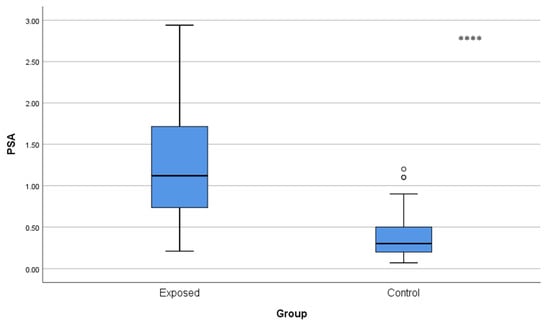 Comparison of blood PSA levels between Cd-exposed and control groups. Box-plot elements are defined in the legend of Figure 1a. **** p < 0.001. The independent t-test was used.