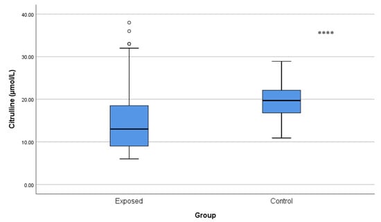 Comparison of citrulline levels between Cd-exposed and control groups. Box-plot elements are defined in the legend of Figure 1a. **** p < 0.001. The independent t-test was used.