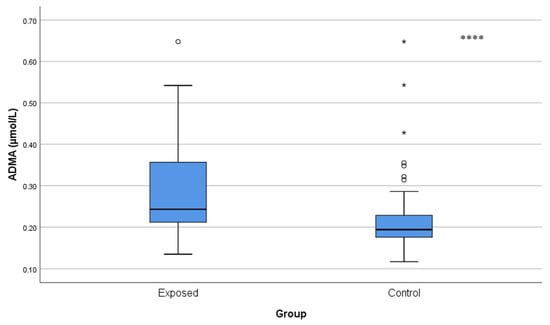 Comparison of ADMA levels between Cd-exposed and control groups. A single asterisk above boxes (*) denotes extreme outliers (values beyond the outer fences, >3 × IQR). Box-plot elements are defined in the legend of Figure 1a. **** p < 0.001. The independent t-test was used.
