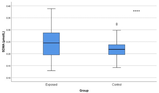 Serum SDMA levels in Cd-exposed versus control groups. Box-plot elements are defined in the legend of Figure 1a. **** p < 0.001. The independent t-test was used.