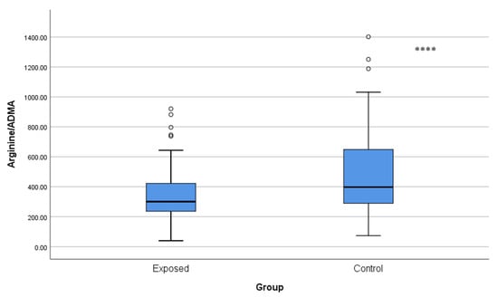 The arginine/ADMA ratio was significantly lower in Cd-exposed workers (339.40 ± 182.05) than in controls (483.27 ± 279.19, p < 0.001), which may indicate decreased ability of NO to be synthesized (Figure 6).