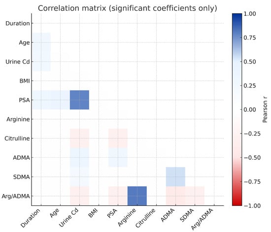 A significant positive association was identified between urinary Cd and PSA (r = 0.783, p < 0.001) and also a significant association with ADMA (r = 0.338, p = 0.002) and SDMA (r = 0.212, p = 0.040). A negative relationship was also identified between urinary Cd and the arginine/ADMA ratio (r = −0.293, p = 0.011) may be consistent with a decreased NO-generating capability (Figure 7, Table S1).