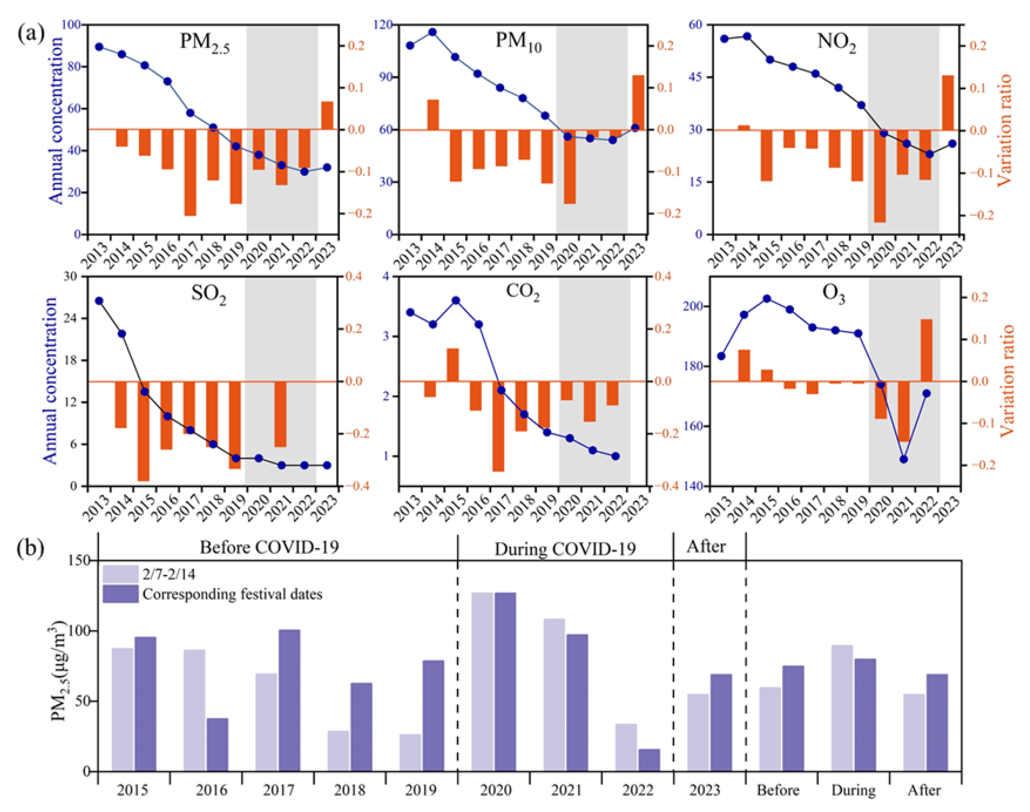 - Si, J.J.; Zhang, L.; Zhang, S.Z.; Li, Y.J.; Zhang, Z.X.; He, Z.Q.; Chen, Y.; Zhan, H.B. Response of air pollution to meteorological conditions and socioeconomic activities associated to the COVID-19 outbreak in the Yangtze River Economic Belt. Atmos. Environ. 2024, 323, 16. [Google Scholar] [CrossRef]