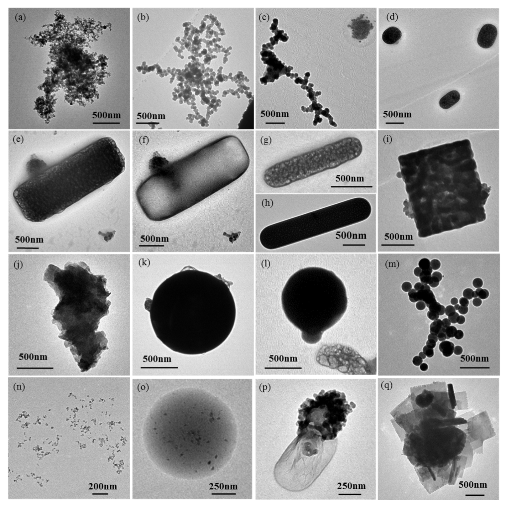 | Types | Elemental Composition | Morphology | Stability Under Electron Beam |