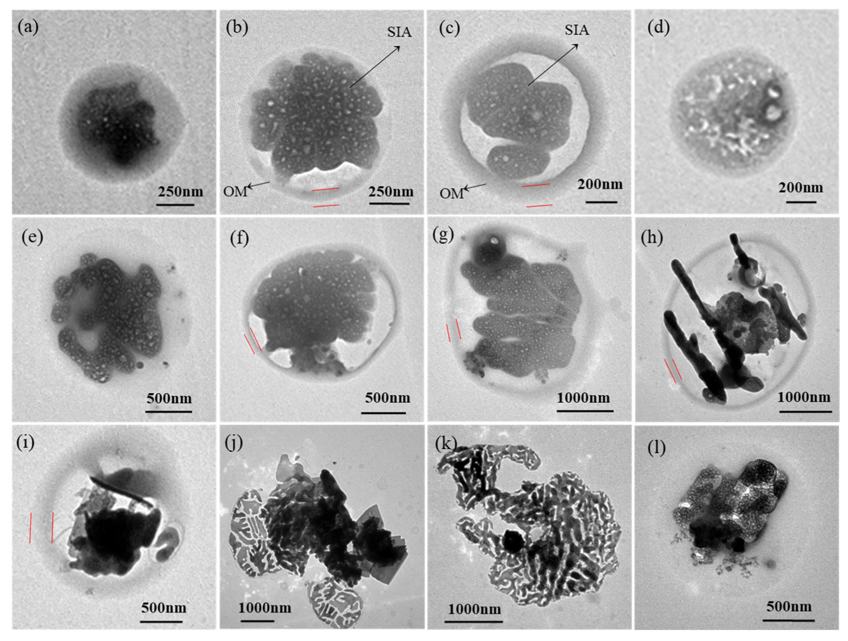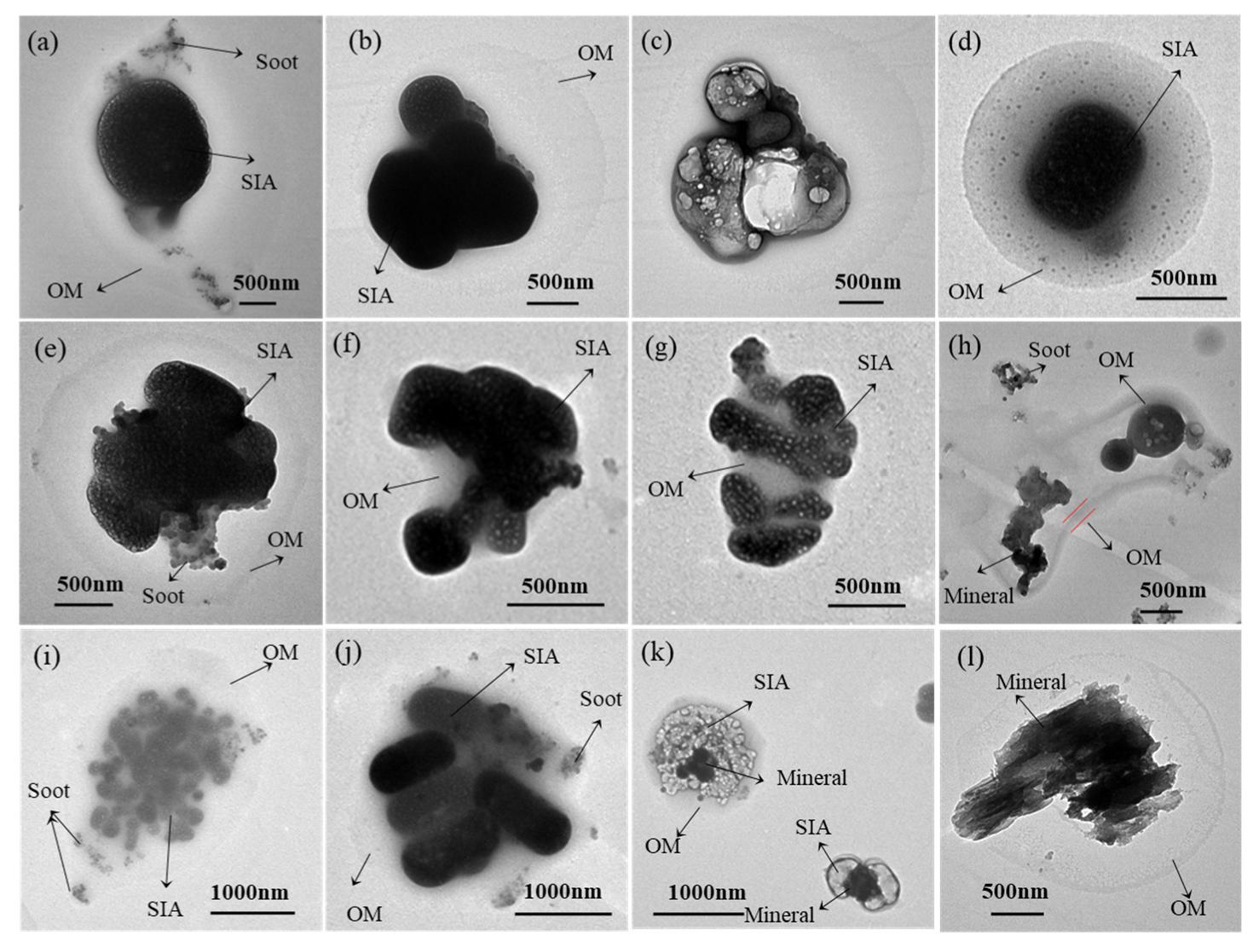 | Organic particle | Mainly composed of C and O, with minor Si, K, and S | Spherical, near-spherical, or irregular morphologies | Stable |