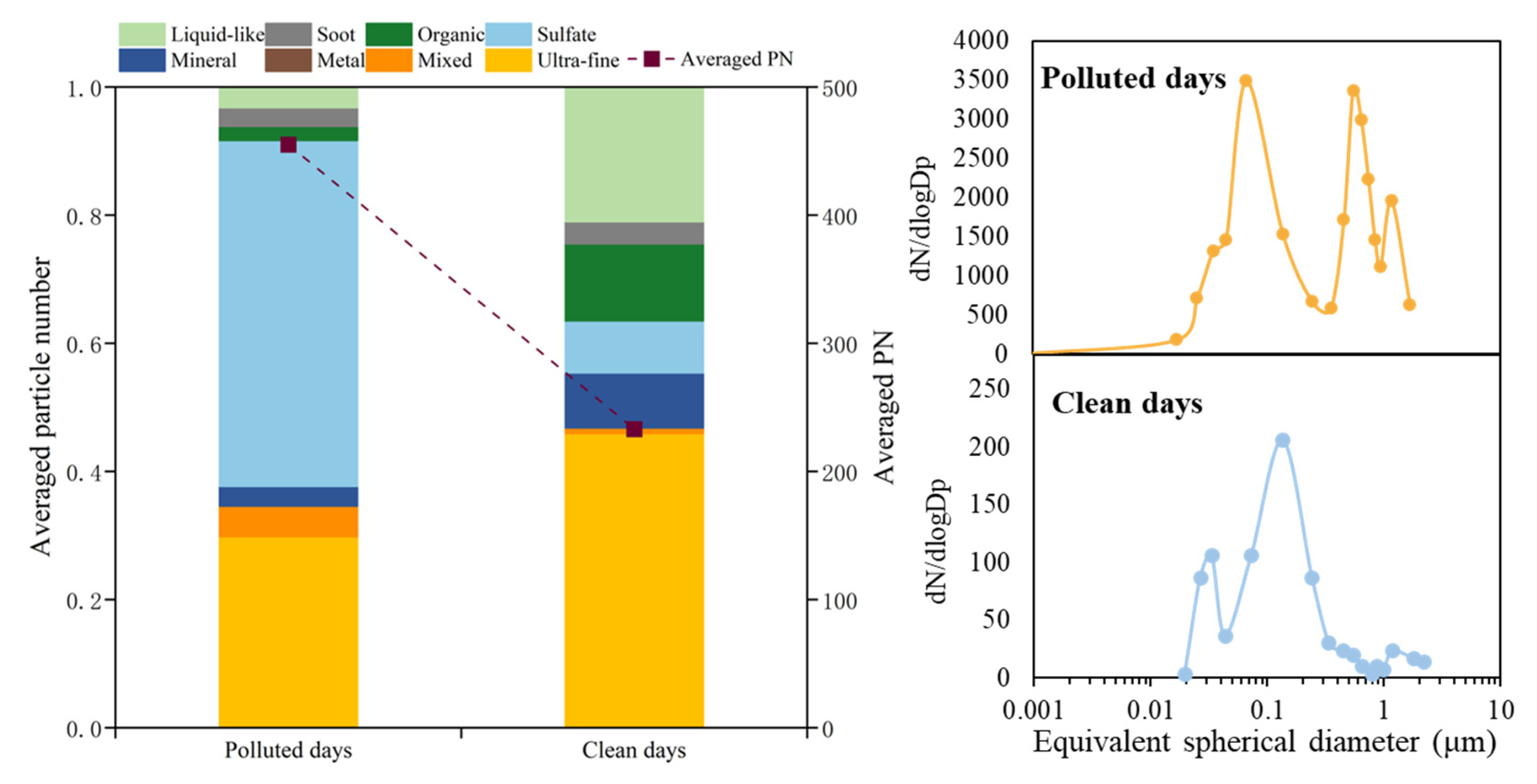 - Airborne aerosol particles collected during the lockdown period were classified into eight types, including soot (2.9%), sulfur-dominant particles (51.5%), mineral particles (3.3%), organic (OM) particles (2.7%), metal-containing particles (0.2%), ultrafine particles (UFPs, 30.7%), droplet-like particles (4.2%), and mixed particles (4.5%). Sulfur-dominant, ultrafine, and mixed particles were the three most abundant types.