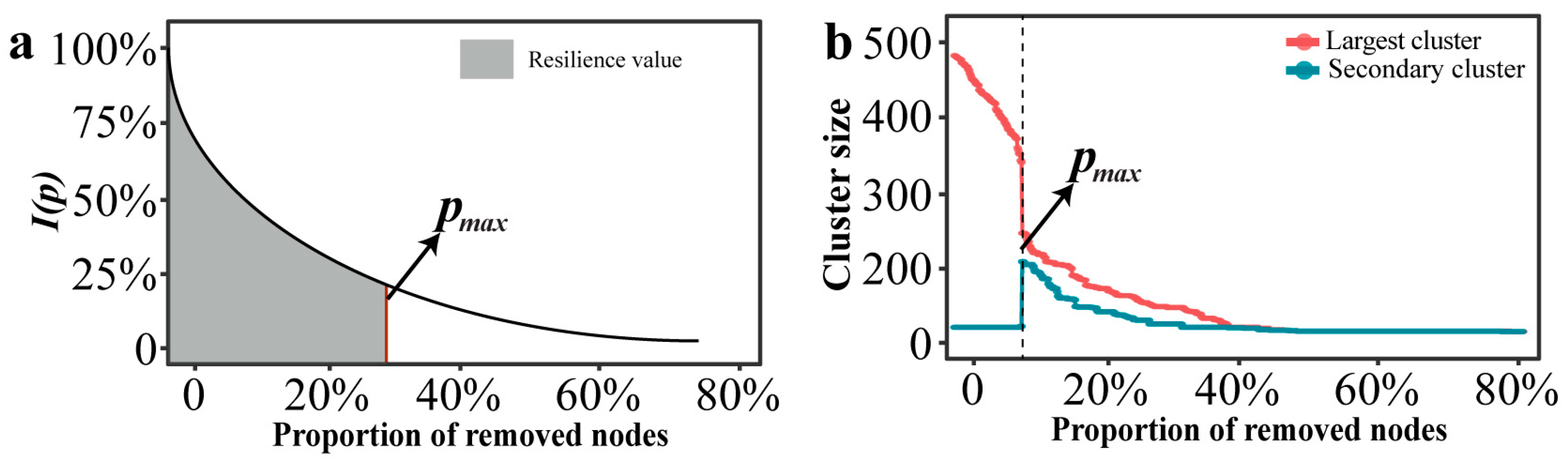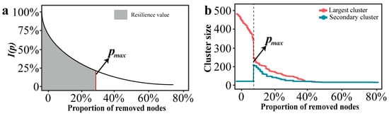 In the research of complex networks, the size of the clusters can characterize the connectivity of the network structure [39]. The clusters can be divided into the largest cluster and the secondary cluster. When the nodes failure reaches a certain critical value, the scale of the secondary cluster suddenly increases, while the scale of the largest cluster suddenly decreases. The network collapse threshold (denoted as pmax) was operationally defined based on percolation theory. Specifically, pmax corresponds to the critical fraction of removed nodes where the size of the second-largest connected component reaches its maximum value. This peak marks the critical phase transition point where the giant connected component disintegrates into smaller isolated fragments, signifying network collapse [40,41].