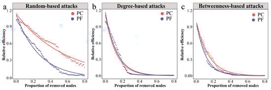 The resilience of a network is not only reflected in its robustness, but also in maintaining a high level of network efficiency as high as possible before the networks crashes. In this study, we used the network characteristic curve of the global efficiency change rate I(p) as a function and the maximum allowable failure “node” proportion pmax as a threshold value to characterize the resilience level of a network (Figure 1a). Fitting models were “y = a·exp(b·x) + c” in “ggtrendline” (version: 1.0.3) R package. This non-linear decay trajectory is characteristic of complex networks under disintegration, where connectivity often collapses rapidly after a critical threshold of node removal, a pattern widely observed in network robustness studies [36,37,38]. The resilience index R was defined as follows:
