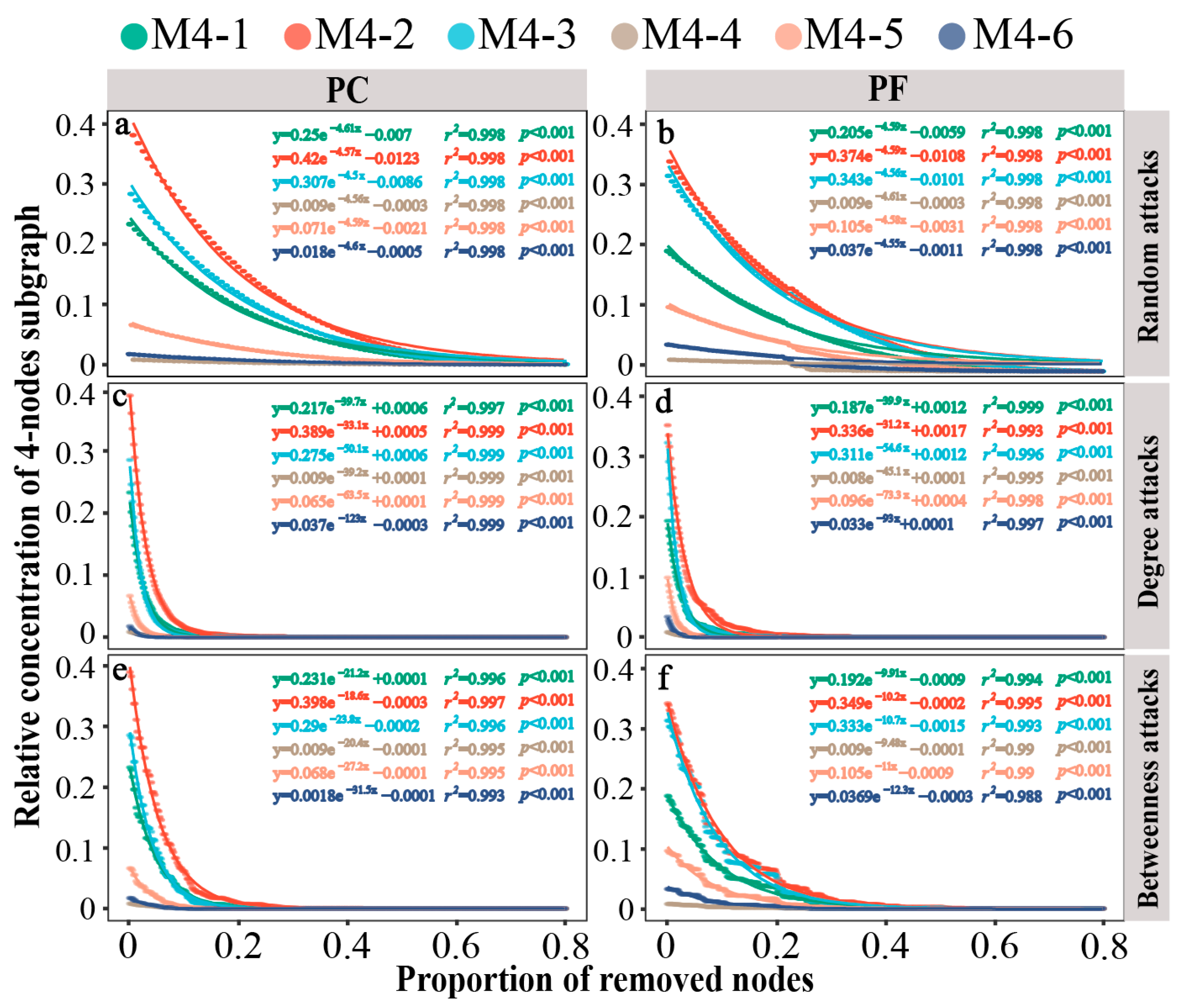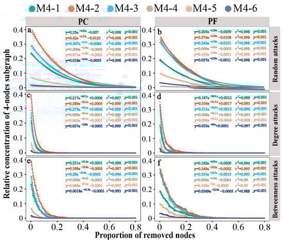 Figure 4. Dynamics of relative concentrations of different 4-node subgraphs in bacterial networks under different attacks. (a) network of greenhouse under random-based attacks; (b) network of open field under random-based attacks; (c) network of greenhouse under degree-based attacks; (d) network of open field under degree-based attacks; (e) network of greenhouse under betweenness-based attacks; (f) network of open field under betweenness-based attacks. Larger shifts upon the same proportion indicate that there is less stability within subgraph types. PC: pesticide-contaminated; PF: pesticide-free soils.