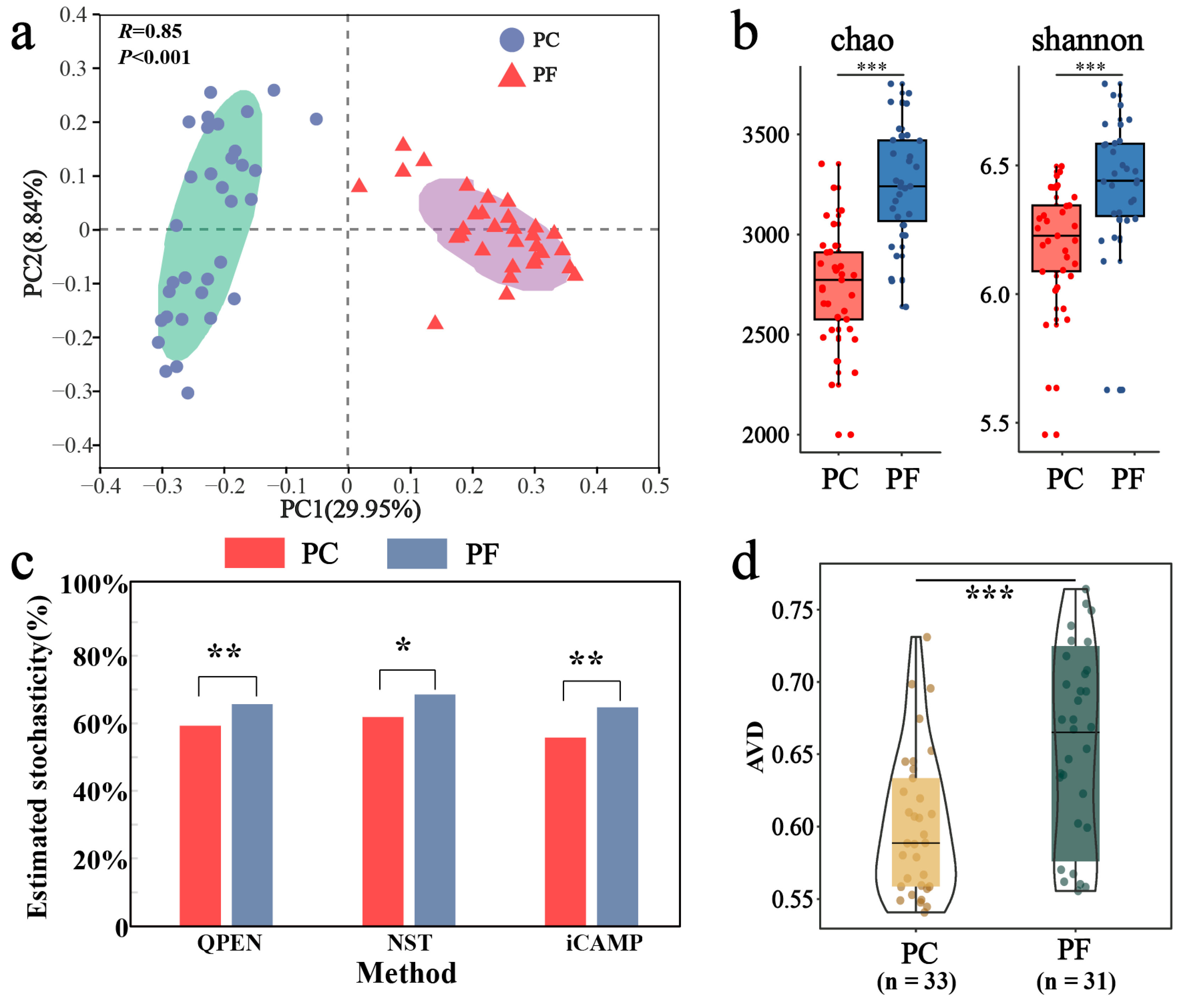 Figure 2. Differences in bacterial community structure and assembly between soils containing pesticide residues and uncontaminated soils. (a) Bacterial community beta-diversity visualized using PCoA ordination based on the Bray–Curtis distance. The BETADISPER analysis revealed no significant difference in multivariate dispersion between groups (p > 0.05), indicating homogeneity of group dispersions. (b) Comparison of alpha-diversity by Chao and Shannon indices. (c) Comparison of stochastic processes inside and outside greenhouses by three assembly models (QPEN, NST, iCAMP). (d) Comparison of community stability from greenhouse to open field using average variation degree (AVD) indices. *: p < 0.05; **: p < 0.01; ***: p < 0.001.