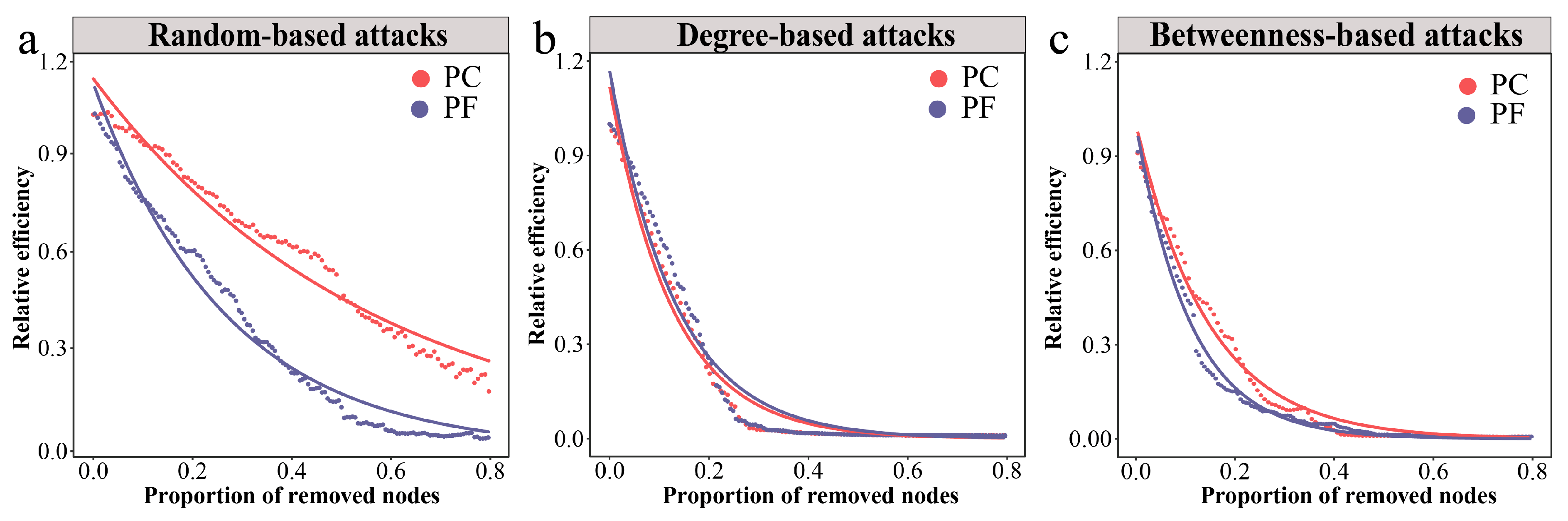 Figure 3. Dynamics of relative global efficiency in bacterial networks under different attacks. (a) Changes in relative global efficiency under random-based attacks. (b) Changes in relative global efficiency under degree-based attacks. (c) Changes in relative global efficiency under betweenness-based attacks. Larger shifts upon the same proportion indicate that there is less stability within subgraph types.