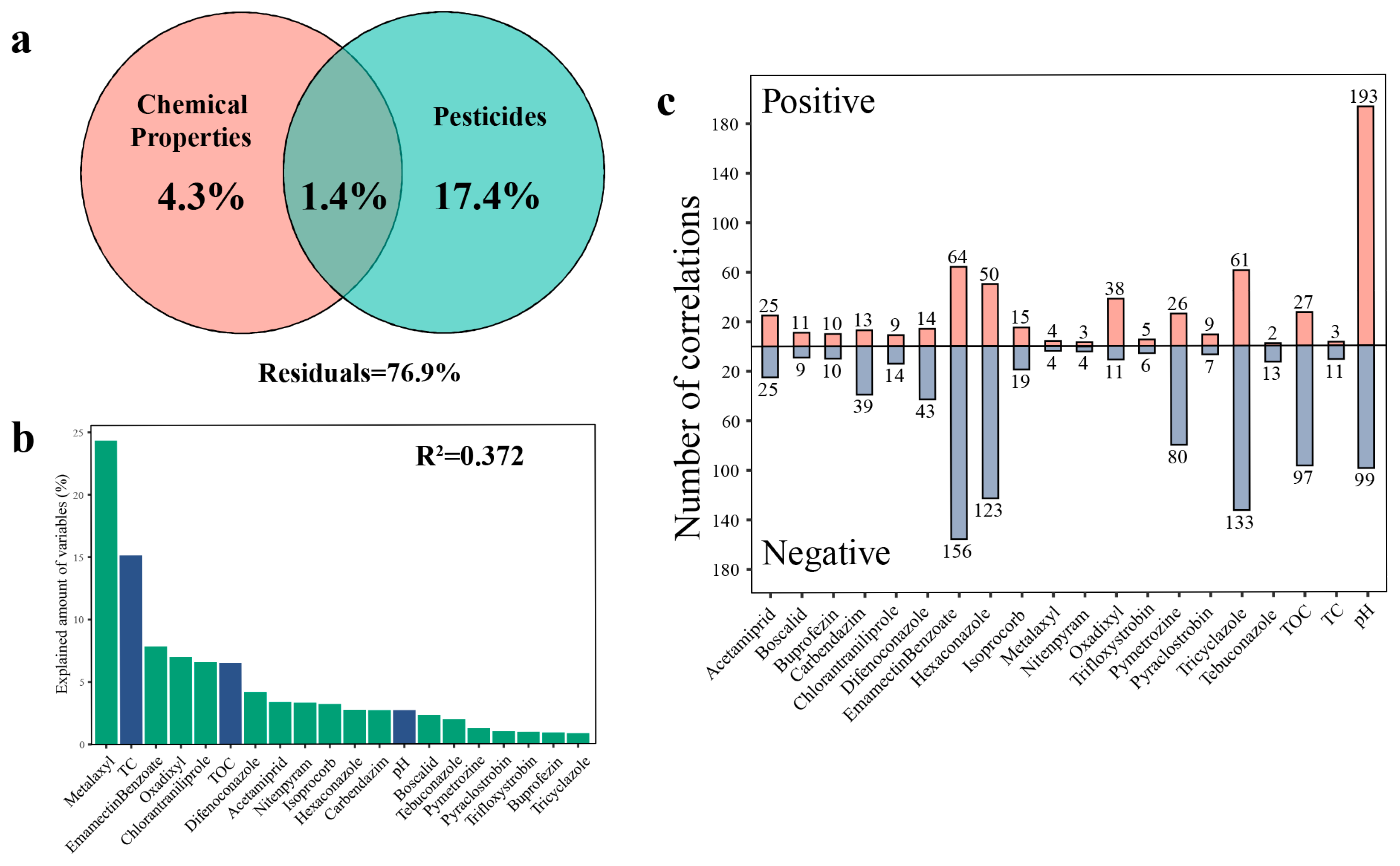 Figure 5. Impact of abiotic factors on the abundance of individual OTUs within pesticide-contaminated soil. (a) Variance partition analysis showing relative contributions of chemical properties and pesticide residues to the community variations based on Bray–Curtis distance. (b) Variance partitioning of different environmental variables at AVD values. Green bars: pesticide types; Blue bars: physicochemical properties. (c) Number of OTUs that significantly changed their abundance in response to abiotic factors of network members. The number at the top of the bar represents the number of OTUs significantly related to corresponding environmental variable. TC: total carbon; TOC: total organic carbon.