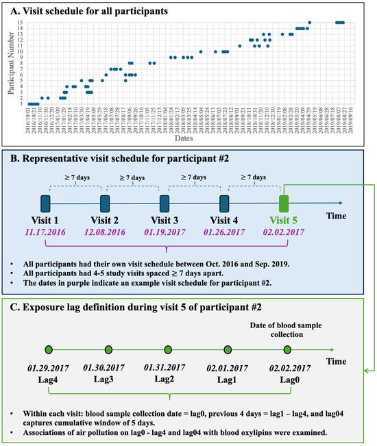 Study visits schedule and exposure lag structure. (A) Distribution of all 4–5 study visits for the 15 participants from October 2016 to September 2019. (B) Representative visit sequence for Participant #2; each visit was separated by ≥7 days. (C) Lag definitions for Participant #2’s fifth visit: blood-draw day = lag0, preceding 4 days = lag1–4, and the 5-day cumulative window = lag04.