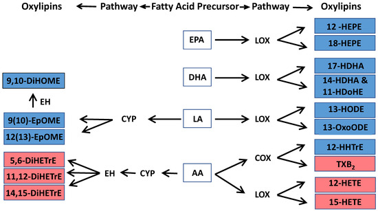 Oxylipins that were associated with low levels of ambient air pollution exposure in this study and their biosynthetic pathways. The oxylipin pathway is defined by a fatty acid precursor-eicosapentaenoic acid (EPA), docosahexaenoic acid (DHA), linoleic acid (LA), or arachidonic acid (AA) that is metabolized by an enzyme-lipoxygenase (LOX), cytochrome p450 (CYP), cyclooxygenase (COX), or epoxide hydrolase (EH). Notes: blue color indicates anti-inflammatory oxylipin, and red color represents pro-inflammatory oxylipin in response to air pollution exposure in this study. Complete names of oxylipins are provided in the list of abbreviations.