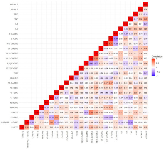 Spearman correlation coefficients between circulating oxylipins and inflammation markers. Complete names of oxylipins and inflammation markers are provided in the list of abbreviations.