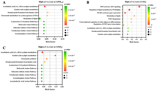 Biological pathways enriched based on significantly identified oxylipins in association with air pollutants between low and high n-3 FA groups. Top 10 enriched biological pathways were presented for (A) PM2.5, (B) O3, and (C) NO2, respectively. Differential oxylipins were processed with MetaboAnalyst 5.0 [https://www.metaboanalyst.ca (accessed on 20 June 2025)] to predict possible biological pathways with a Hypergeometric Test to calculate p-values.